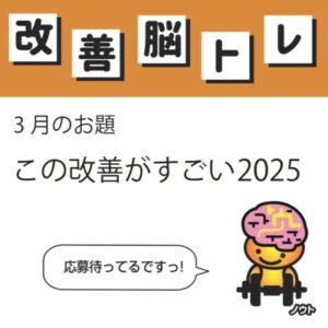 ノウトくんからのお知らせ(12月号) 2025.11.20 お知らせ 創意とくふう12月号 「改善脳トレ」の回答を募集いたします。 お題:この改善がすごい2025 25年1月~12月号の中から「すごい」と思った事例を一つ選んでください。 「〇月号〇ページ」とその理由も教えてください。 賞金5,000円を、応募者の中から1名様に抽選で決定します。 締め切り:12月20日(土) ※2026年3月号「創意とくふう」にて 発表・掲載させて頂きます。