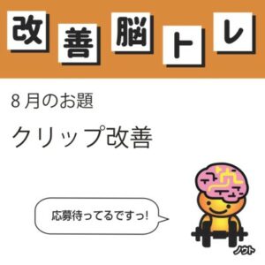 ノウトくんからのお知らせ(5月号) 2026.04.20 お知らせ 創意とくふう5月号 「改善脳トレ」の回答を募集いたします。 お題:クリップ改善 どこにでもあるクリップ。 ゼムクリップ、ダブルクリップ、目玉クリップなど、種類はイロイロ。そんなクリップを活用した改善を教えてください。 締め切り:5月20日(水) ※2026年8月号「創意とくふう」にて 発表・掲載させて頂きます。