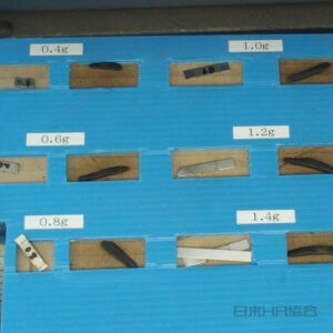 枠に入れて混在防止 2026.04.20 カイゼン事例 改善前 重さ順に「重り」を並べて置いているが、どれがどのグラム数か分かりづらい。 改善後 プラダンで枠を作り、「重り」の置き場にした。枠に各グラム数を表示した。 事例提供:株式会社赤松電機製作所 ※無断転載厳禁:ご利用の際はご連絡ください 効果 グラム数がすぐ分かり、枠の中に「重り」があるので、他と混ざることを防いだ。 カイゼンの定石 分ける化 混ざりにく化 表示